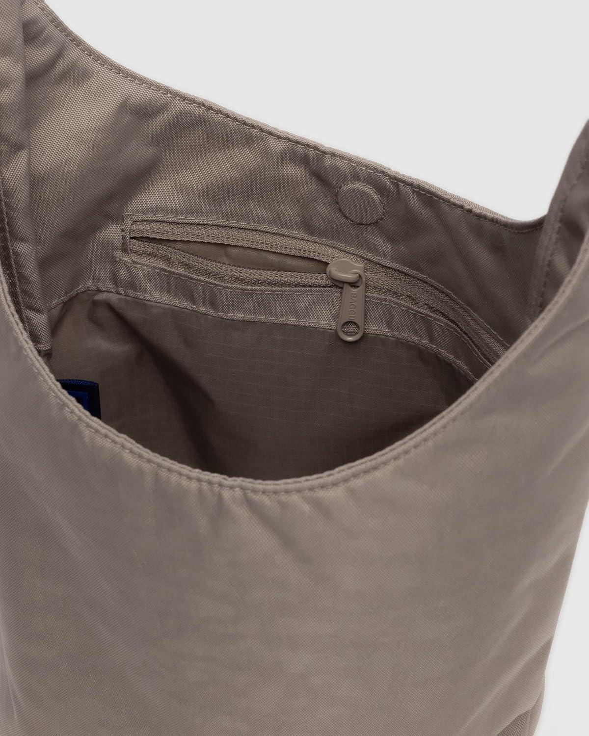 A relaxed, gently structured nylon bag with an adjustable strap. It features an interior zip pocket with a magnetic closure.